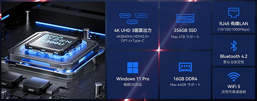 | CPU | AMD Ryzen 3 4300U、4コア 4スレッド、最大 3.7GHz、TDP 28W |