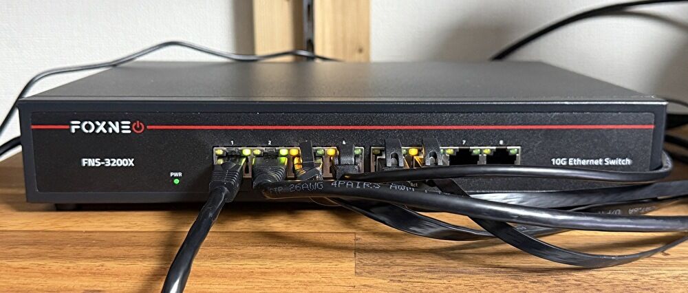 - ONUの10G RJ45ポートから 2階の自分の部屋に設置の10G x 8ポートのスイッチングハブ「Foxneo、FNS-3200X」に接続。