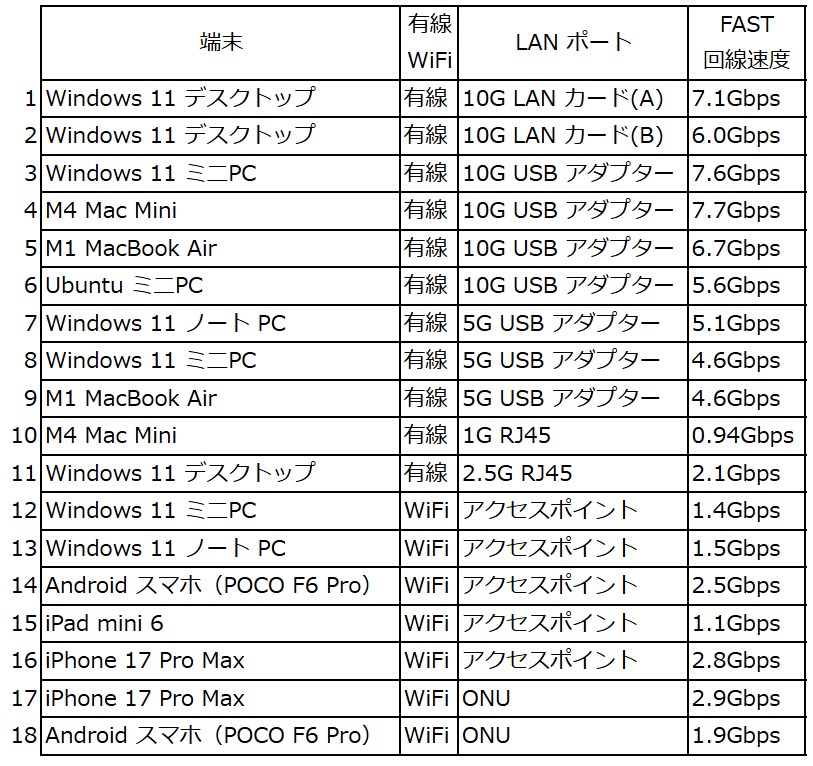 ▲▼同一日の2時間以内に複数のPC、スマホ、10G アダプターにて計測しました。