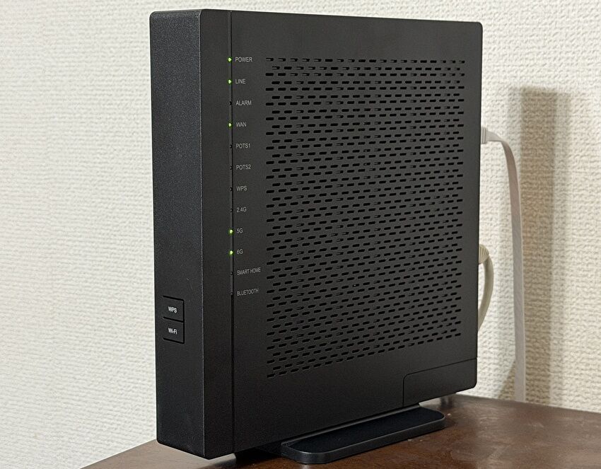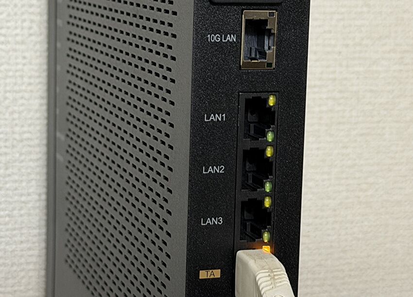 Nuro 光 10GのONU(無料レンタル)は、もちろん 10G対応の製品です(上の写真は 10Gポートのケーブルを外して撮影しています)。ちなみに、私はNuro 光 2Gの契約時より、「Nuro 光 でんわ」を利用しています。
