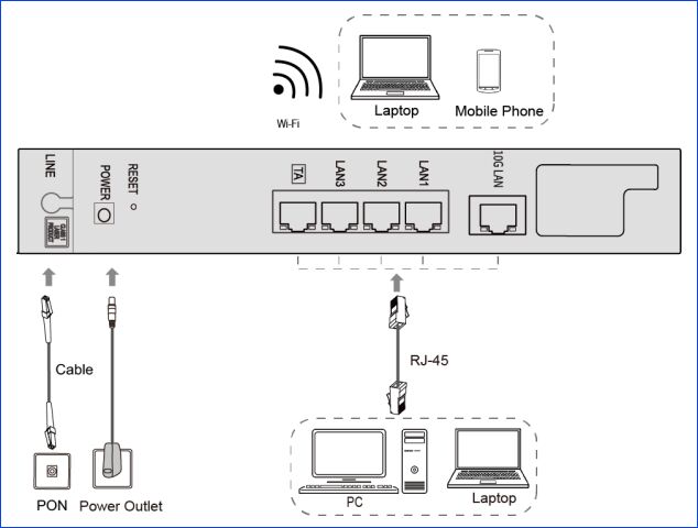 ▼上記公式サイトからダウンロードの説明書からの引用ですが、ONUのRJ45 10Gは1ポートのみ、残りの3ポートは全て1Gです。1Gではなく、せめて1ポートのみでも2.5Gであるとよかったのですが。なお、私は1ポートのみの10Gを活かすため、後述の10G 8ポートのスイッチングハブを別途購入のうえ、使用しています。
