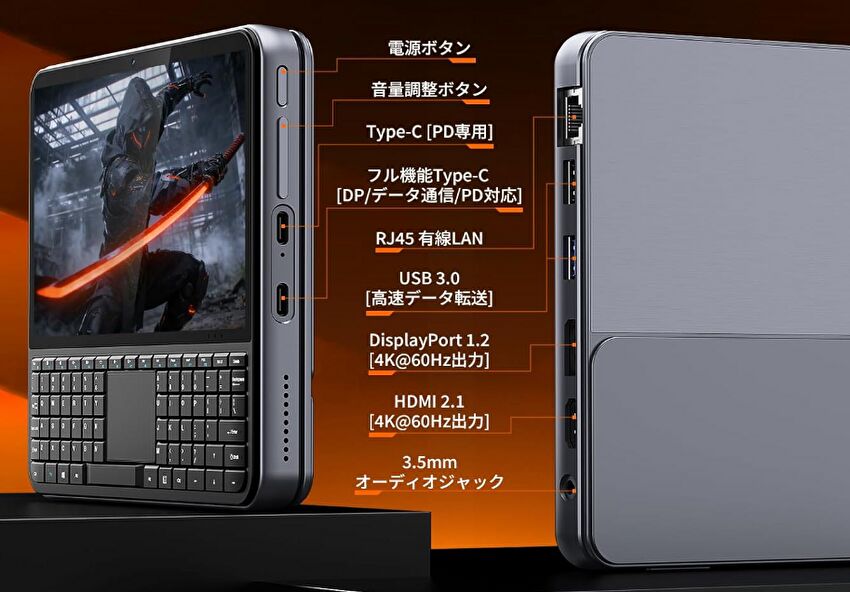 158.5 x 136.5 x 20.5mmの iPad miniよりも小さなサイズに 5.7インチ液晶とキーボードを備え、さらには メモリとM.2 SSDを換装可能です。また、USB-C x 2ポート、HDMI、DP、RJ45を装備し拡張性にも優れています。