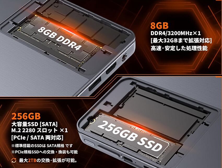 | ストレージ | M.2 SATA SSD 256GB / 512GB、NVMeにも対応、スロット形式・換装可能 |
