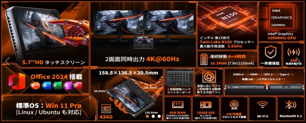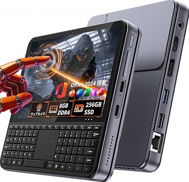冒頭に記載の特徴に加え、100万画素のフロントカメラを搭載、5.7インチ HD解像度の液晶はタッチパネル、Office 2024を搭載など、小さな筐体に機能が凝縮されています。