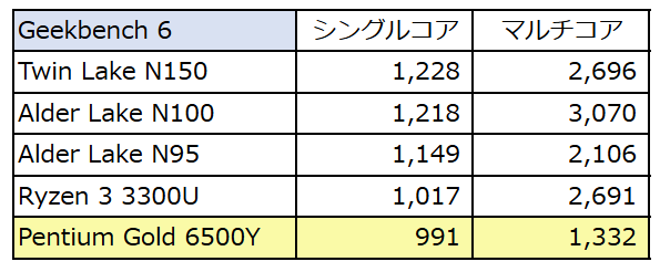 ▲▼上の記事は、2021年9月に投稿の記事ですが、Pentium Gold 6500YはSuface Go 3に搭載のCPUです。下表は、所有するエントリークラスのCPUを搭載するPC実機で計測のGeekbench 6のスコアです。