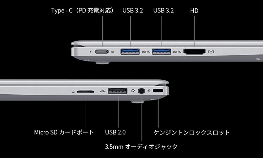 | ポート類 | USB-C(充電に対応)、USB-A 3.2 Gen1 x 2、USB-A 2.0、HDMI、Micro SDカードスロット |
