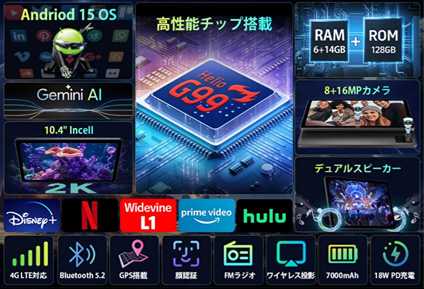 2026年1月4日現在、Amazonでは 16,998円で販売されており、Helio G99を搭載、10.4インチ FHDの液晶、6GBの物理メモリ、LTEに対応のタブレットとしては安い部類です。Helio G99を搭載し、価格的にも競合する製品は、以下の関連記事に掲載しています。