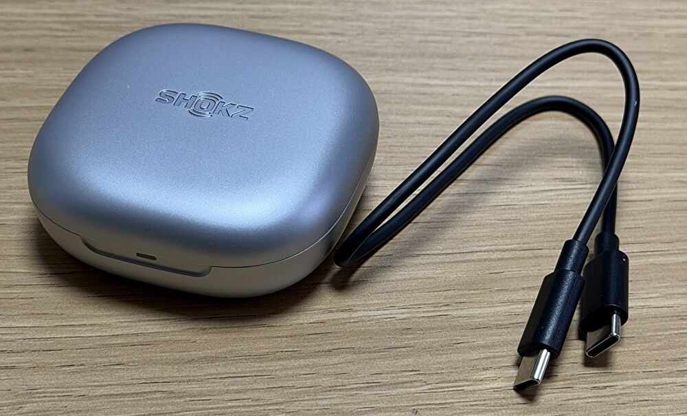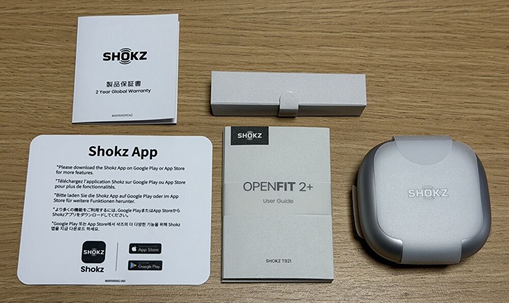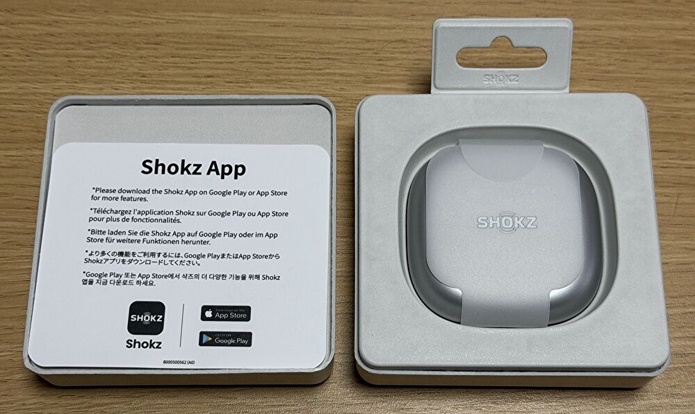 ▼付属品は左上から、製品保証書、Shokz アプリのしおり、USB-C to USB-C ケーブル、説明書、本体。説明書は日本語も含めて多言語表記ですが、文字が小さく、老眼の私には遠近両用コンタクトを装用しても判読できないもの。ただし、後述の「Shokz」アプリにおいて、ユーザーガイドの項目がありますので課題とはなりません。
