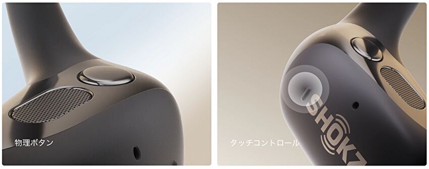 ▲▼本体でのコントロール・操作として、タッチコントロールのほか、物理ボタンを備えていることも特徴の一つです。イヤホンのタッチコントロールの操作が苦手な私としては、物理ボタンの装備はメリットとなります。また、タッチコントロール・物理ボタンともに、「Shokz」アプリにて機能のカスタマイズが可能です。