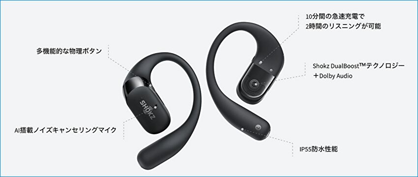 - 業界初のShokzのDualBoost™テクノロジーを搭載。2つの独立したスピーカー、重低音の超大型低周波ユニット、独立した高周波ユニットにより、ダイナミックなサウンドを実現。
