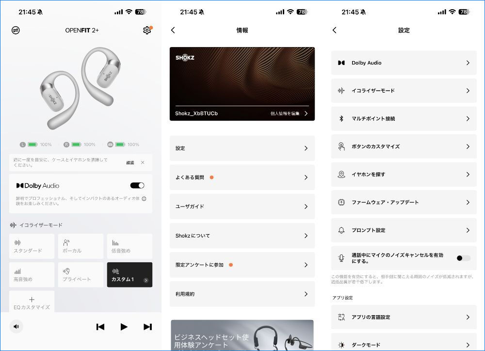 - 「Shokz App」により、5つのプリセットのイコライザーモードでのカスタマイズ、2つのイコライザーで自分のサウンドを作成も可能。