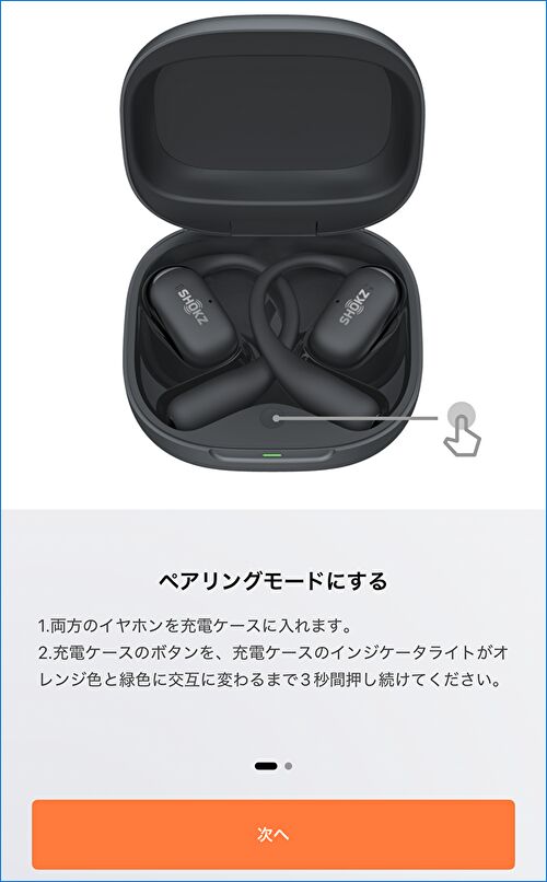 - 充電ケースのボタンを、充電ケースのインジケーターライトがオレンジ色と緑色に交互に変わるまで3秒間押し続けます。