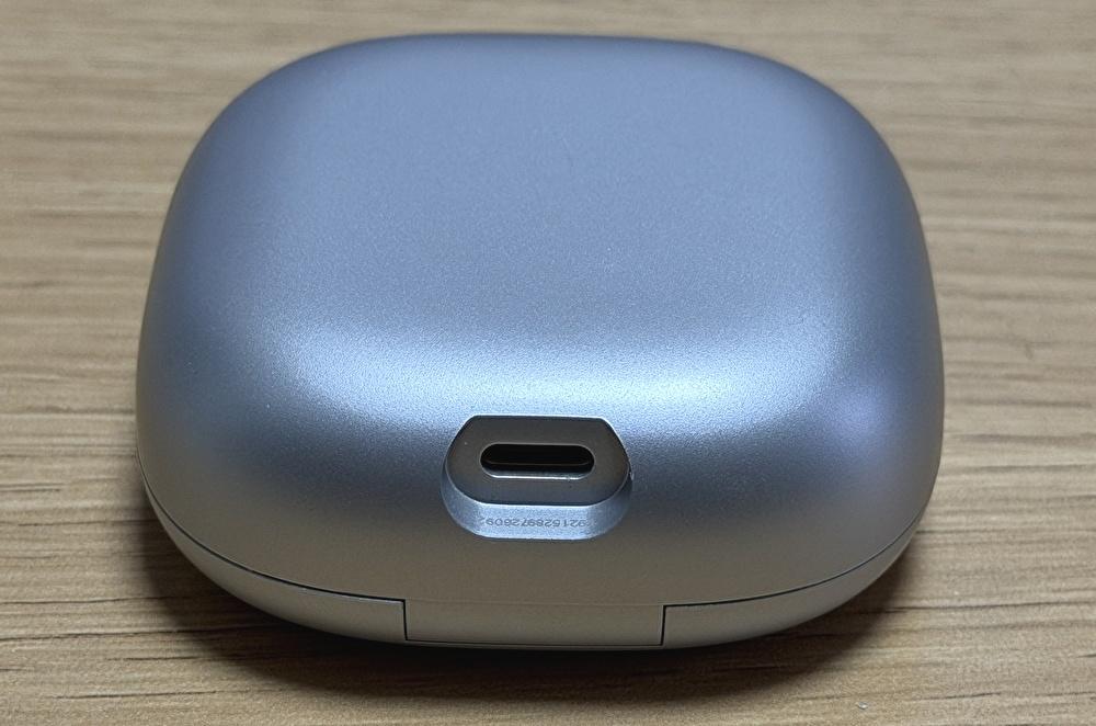 ▼ケースの内側も実際よりもホワイトに写っていますが、実際には本体と同じく、グレイとオフホワイトが混ざったような色です。また、イヤホン本体は艶消しですが、ケースの内側は多少の艶あり(ケース蓋の内側は艶なし)です。なお、本体・ケースともに、指紋や油脂が目につくことはありません。