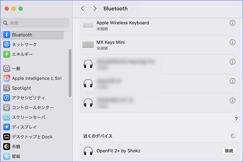 M4 Mac miniとの接続です。認識はiPhoneよりも僅かに遅いように感じましたが、ごく短時間で認識、ペアリング完了です。