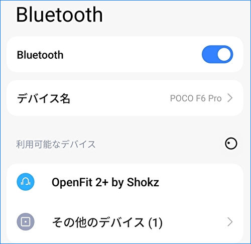 iPhoneと比較すると若干時間を要しましたが、Android スマホとの初回ペアリングもスムーズです。iPhoneと同様に「OpenFit 2+ by Shokz」として認識しています。
