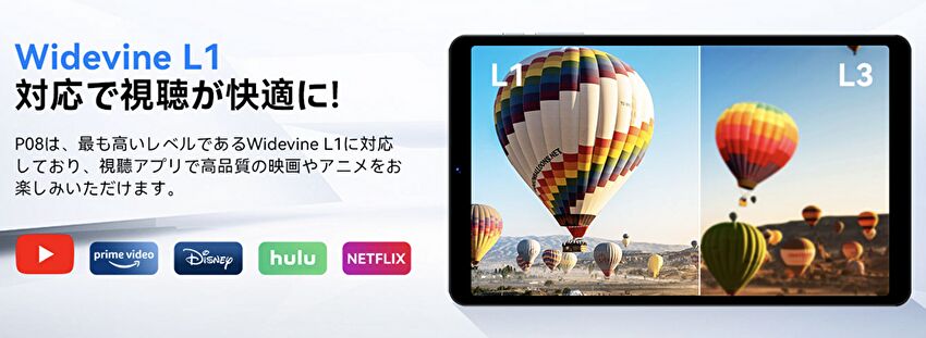 - Netflixも含めた「Widevine L1」に対応。これにより、動画配信サイトの動画を高画質再生可能です。ただし、液晶の解像度がHDですので、動画再生もHDどまりです。