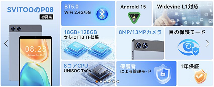 1万円台前半の8.7インチ Android タブレットが複数販売されていますが、「SVITOO P08」もその一つです。SoCには 8コアのUNISOC T606を搭載し、物理メモリ 4GB、LTEに未対応のWiFi モデルです。2025年10月26日現在のAmazon 価格は、専用ケースが付属し クーポン利用により 12,153円です。