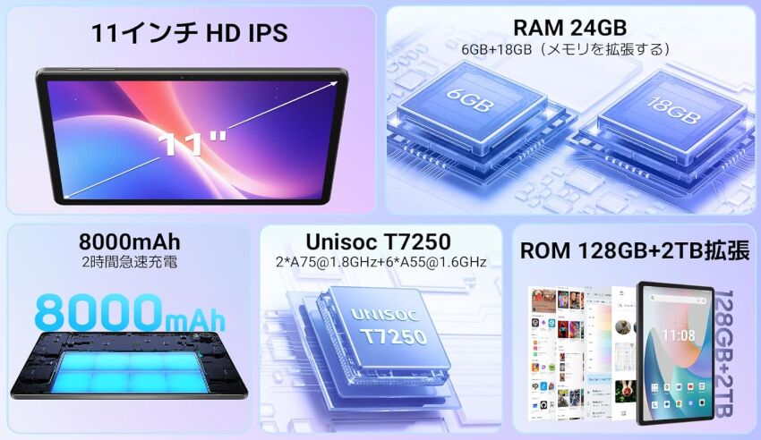 AnTuTu ベンチスコアが約26万となる UNISOC T7250に物理メモリ 6GBを搭載し、2026年1月24日現在のAmazon 価格は 15,199円。なお、11インチ液晶の解像度はFHDではなく、解像度 1280 x 800のHD画質となり、LTEに未対応のWiFi モデルです。