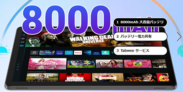 | バッテリー | 8000mAh、18W 急速充電(ただし、PD対応アダプターを別途用意) |