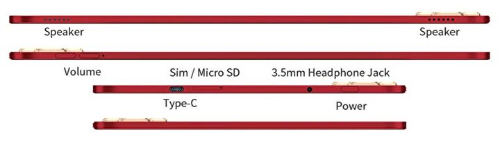 ▼2スピーカーは横持ちでの下サイドに備えています。横の両サイドに備えているタブレットと比較し、動画視聴時などへの体感できる影響はありません(他のタブレットの使用感より)。なお、以下の画像では、厚みを実機よりも狭く見せていることに留意ください。