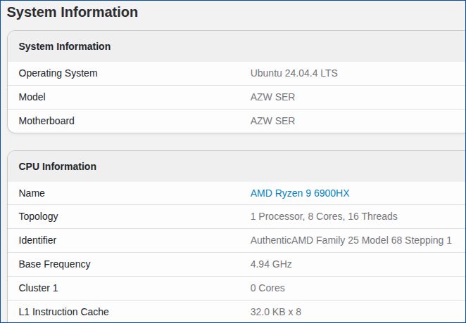 ▲▼上の記事にて掲載の、AMD Ryzen 9 6900HXを搭載するミニPCでの計測事例です。2つめのスコアは、同PCのWindows 11での結果ですが、Ubuntuでのシングルコアのスコアは 1割ほど低いもの。