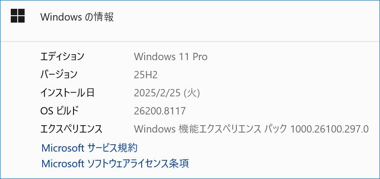▼勝手に電源オンとなるのは自作PCですが、Windows 11のバージョンは以下の25H2です。