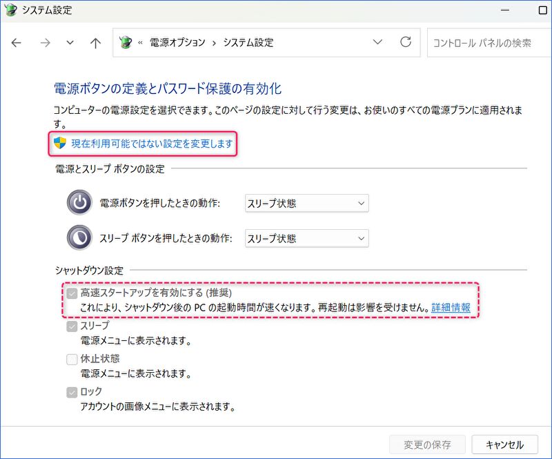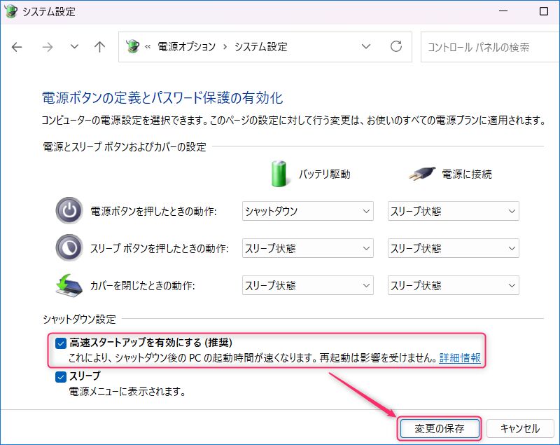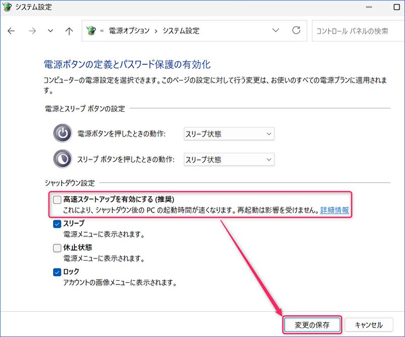▼「高速スタートアップを有効にする」のチェックを外し、「変更の保存」を押下して完了です。その後、PCの電源をオフにし、勝手に電源オンとならないことを確認します。