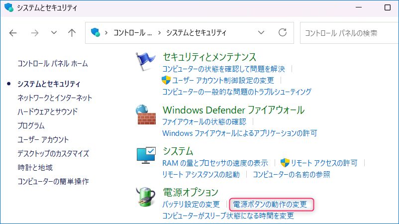 ▼「電源オプション」の項目にある「電源ボタンの動作の変更」を押下します。