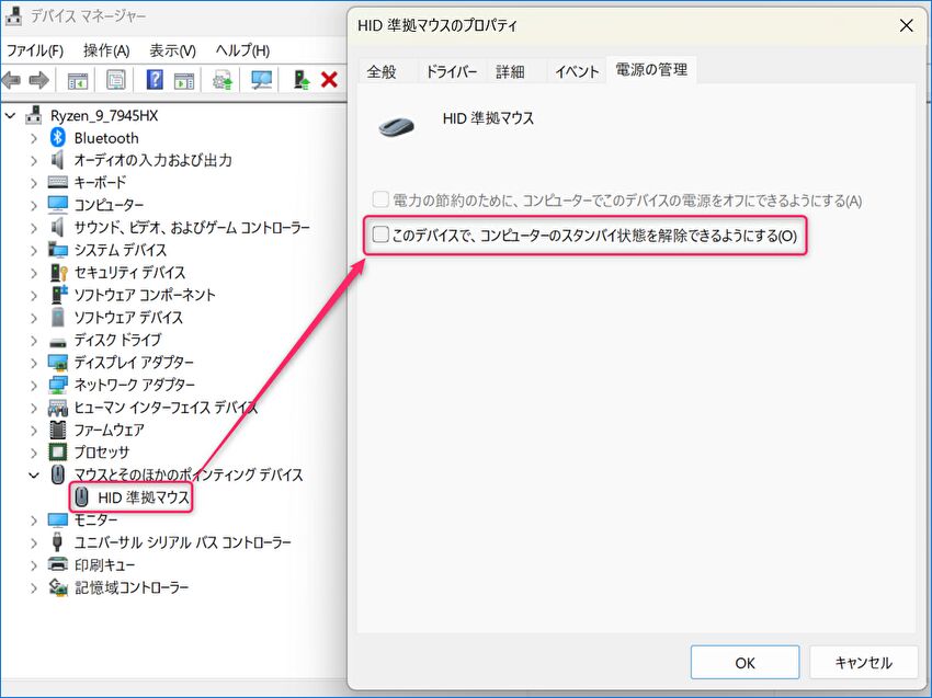 ▼上記3の「マウスによる復帰の解除」の事例です。デバイスマネージャーを開き、マウスの「このデバイスで、コンピューターのスタンバイ状態を解除できるようにする」を無効化します。私の場合、この対応では解決できず。