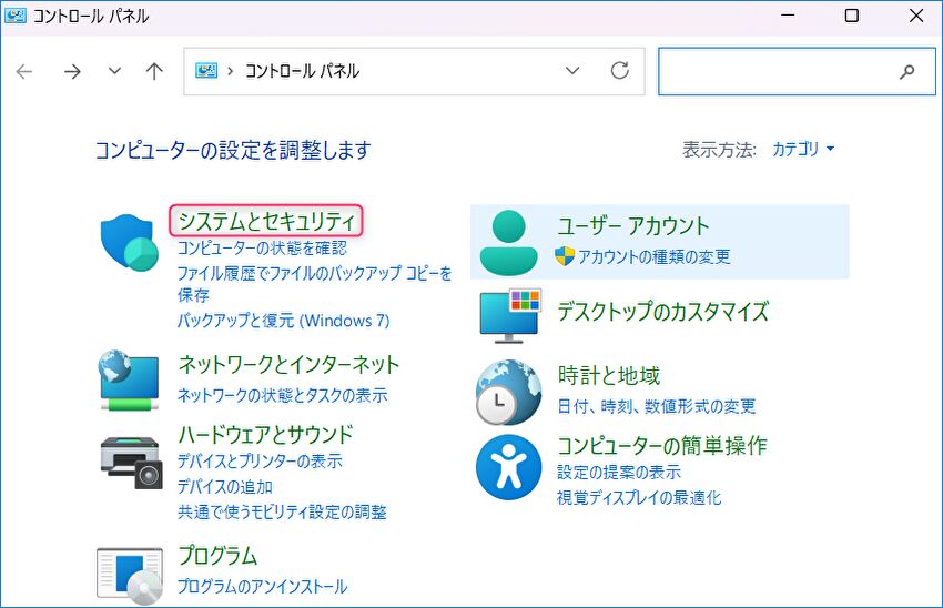 ▼「コントロールパネル」を開き、「システムとセキュリティ」を押下します。