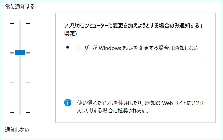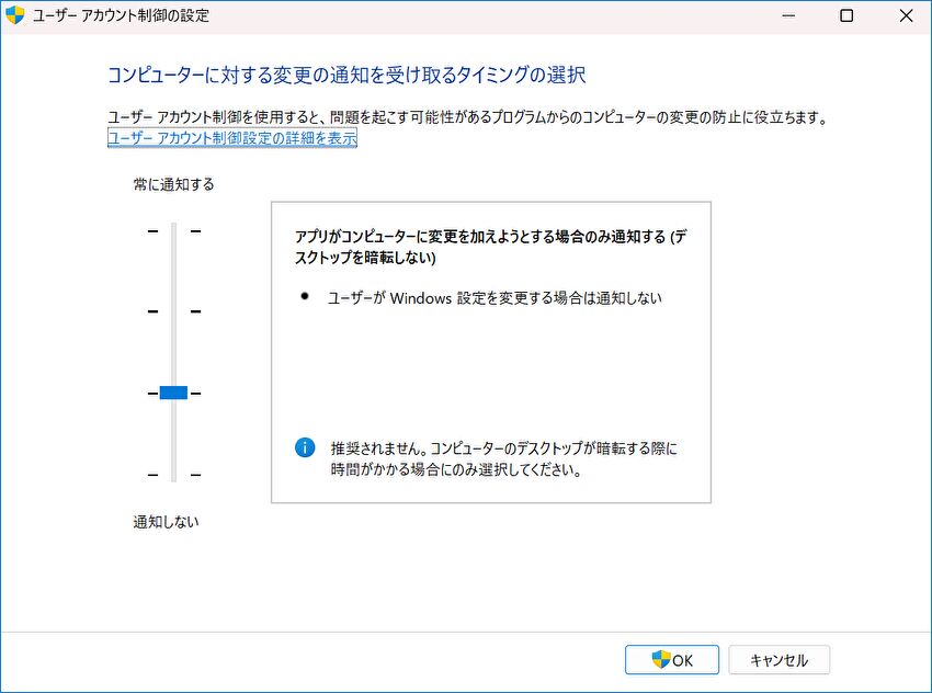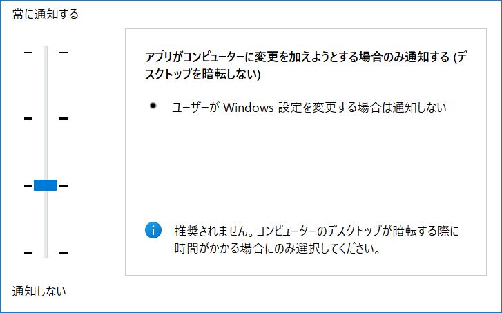 ▼上のデフォルトから、下の画像のとおり、縦のバーを一つ下に変更し、右下の「OK」を押下します。「アプリがコンピューターに変更を加えようとする場合のみ通知する(デスクトップを暗転しない)」とあります。