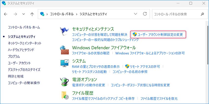 ▼タスクバーの検索窓に「コントロール」などと入力し、コントロールパネルを起動します。起動後、以下の画面の「ユーザーアカウント制御設定の変更」を選択します。