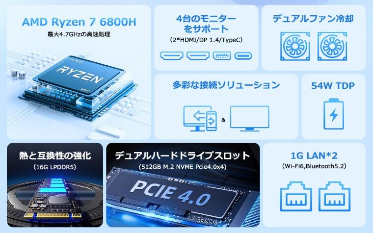 Amazonにて、CPUにAMD Ryzen 7 6800H、メモリ 16GB、SSD 512GBを搭載するミニPC「YCTipc ZHR6800H」が 53,900円にて販売されています(2026年1月24日現在)。