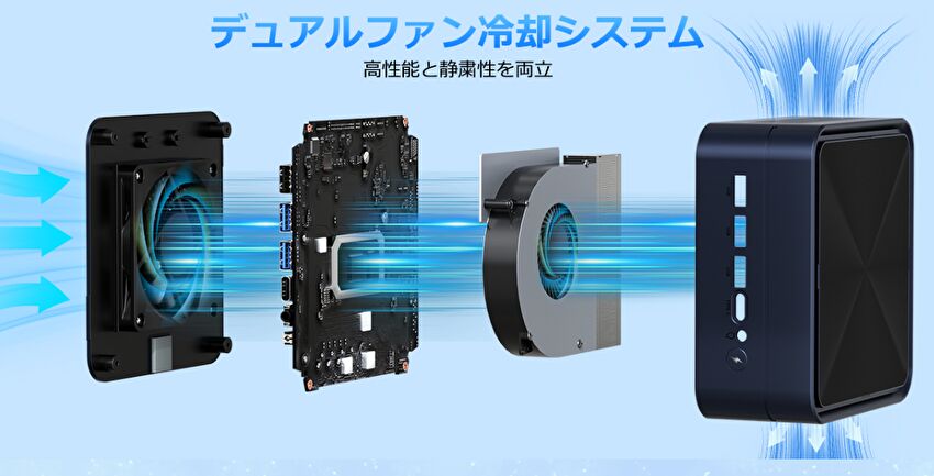 ▼ AMD Ryzen 7 6800H / オンボードメモリ 16GBでは、冷却にそれほど気を遣う必要はありませんが、SSDなどの冷却用にシステムファンを備えています。また、製品ページにファン音量の記載はありませんが、私の同クラス(やや上位)のCPUを搭載するミニPCの事例では静音です。